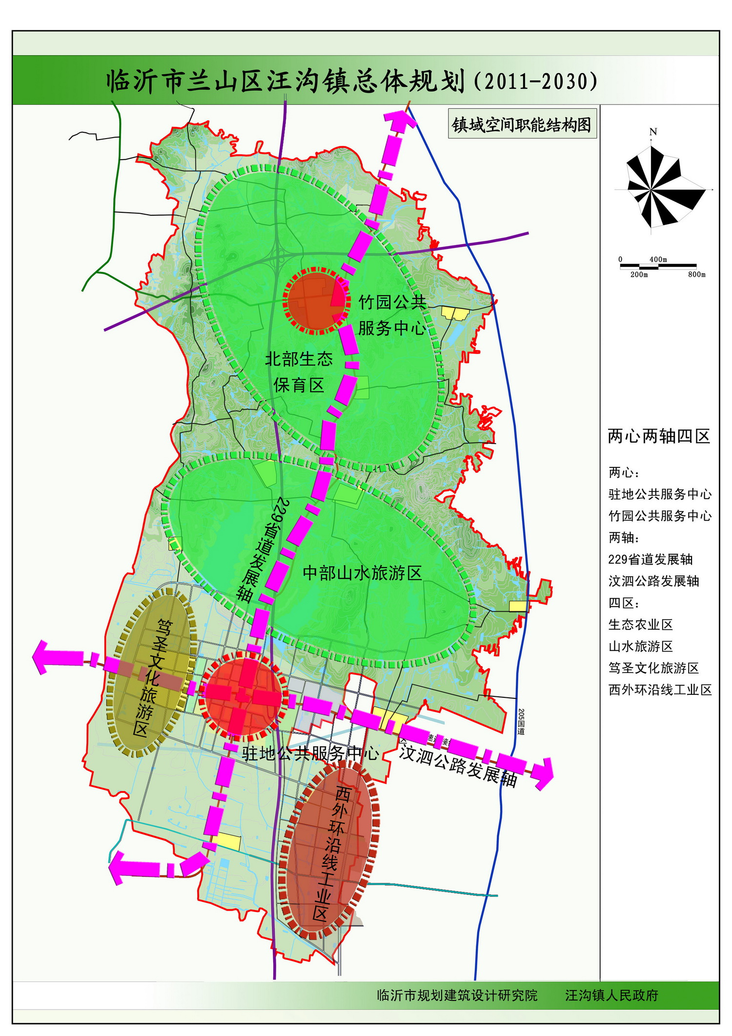 一心:即汪沟镇核心区域,指以行政办公、商业服务、文化体育设施等功能为一体的城镇政治经济中心;
