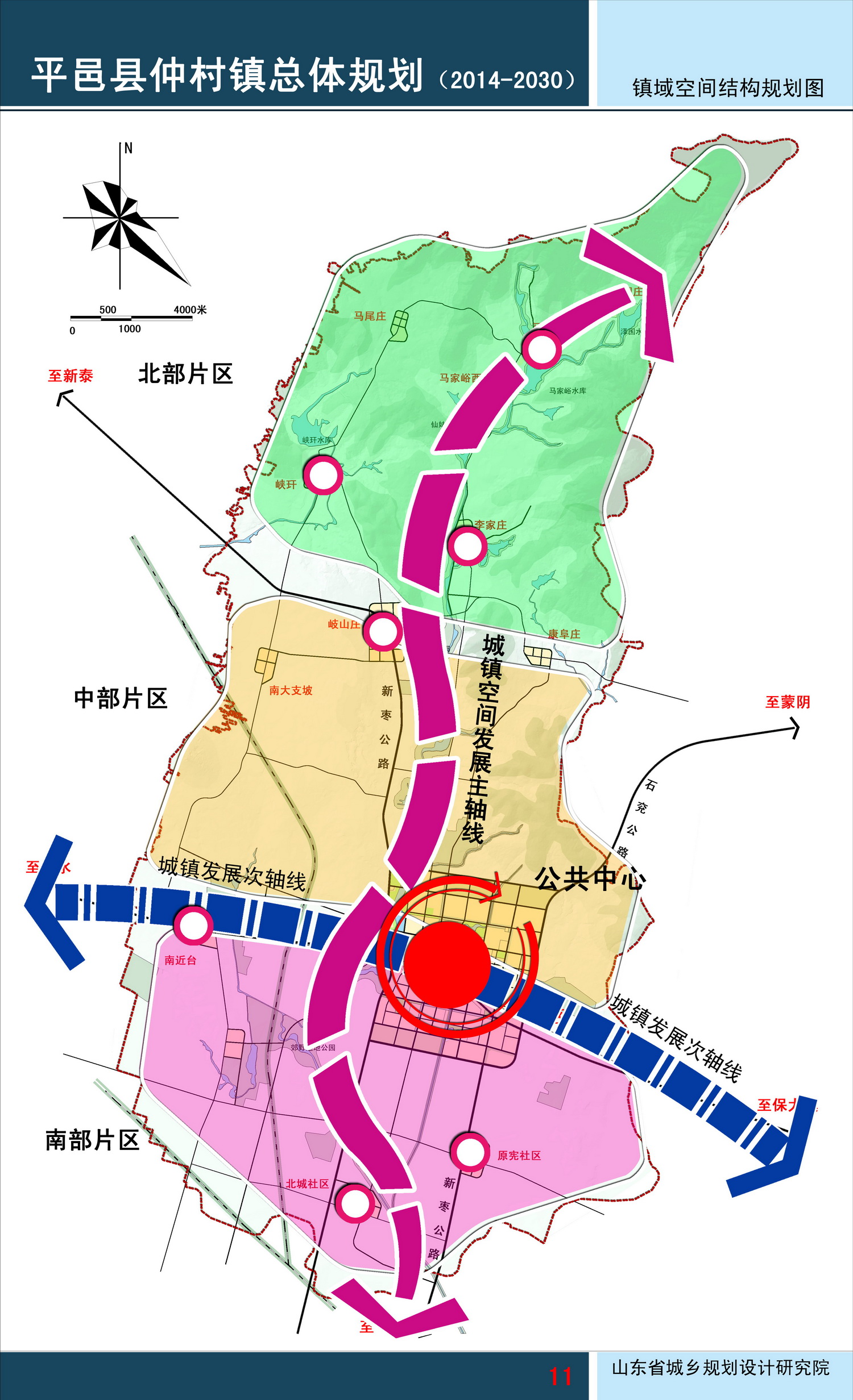 2、镇域总体空间布局结构为: 一心、两轴、三区、七点。