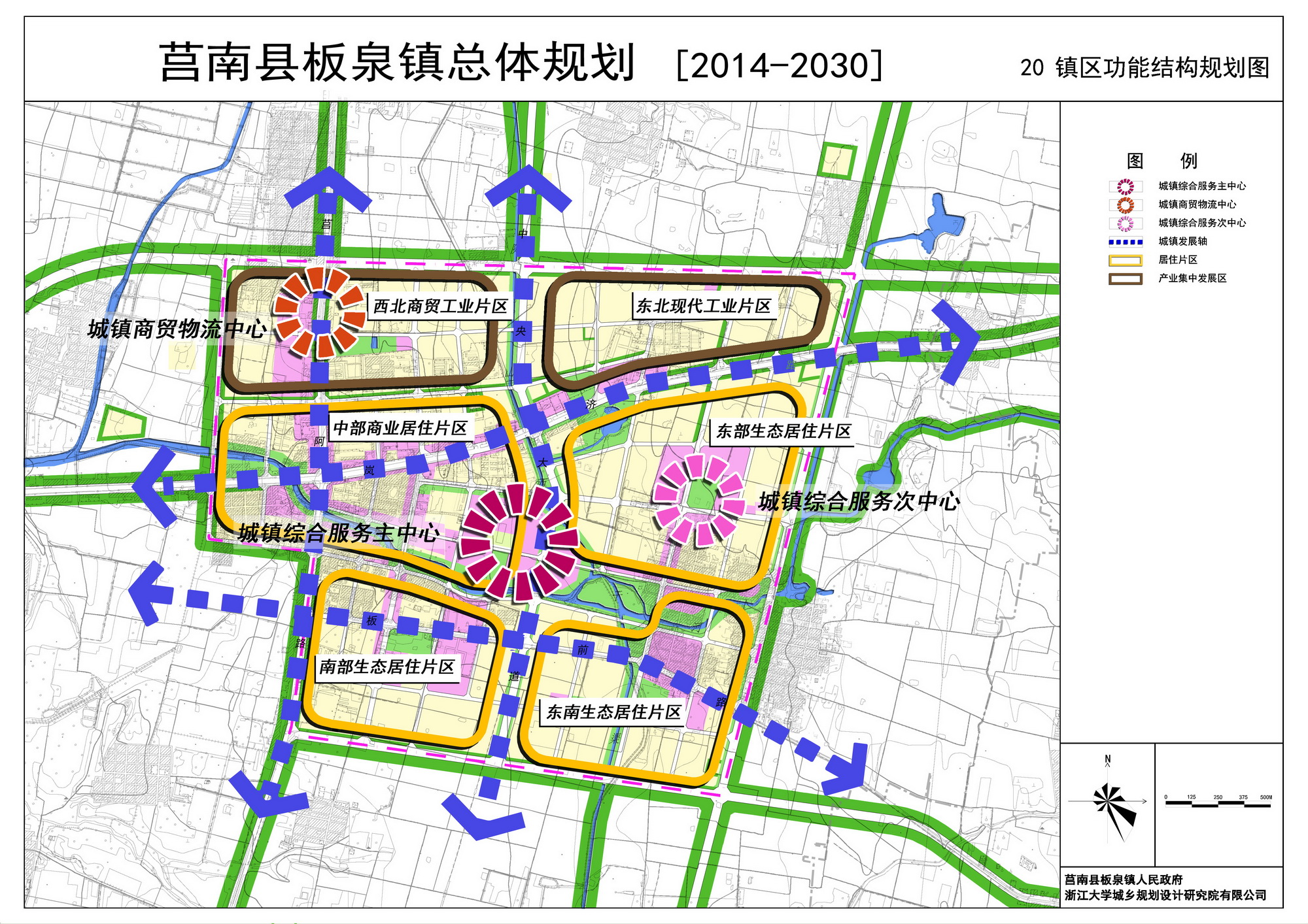 “六片”:将镇区整体划分为“西北商贸工业片区、东北现代工业片区、中部商业居住片区、南部生态居住片区、东部生态居住片区、东南生态居住片区”六大功能片区。