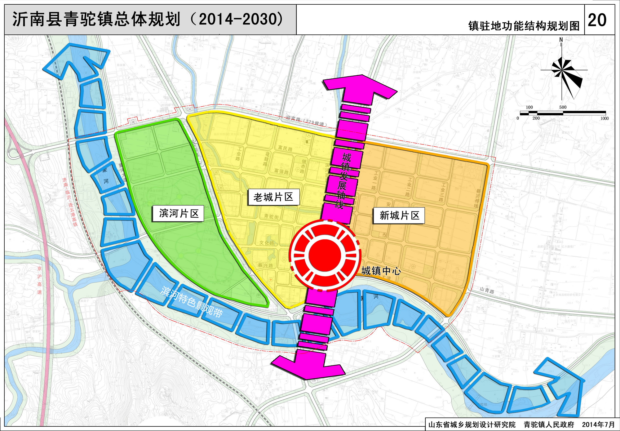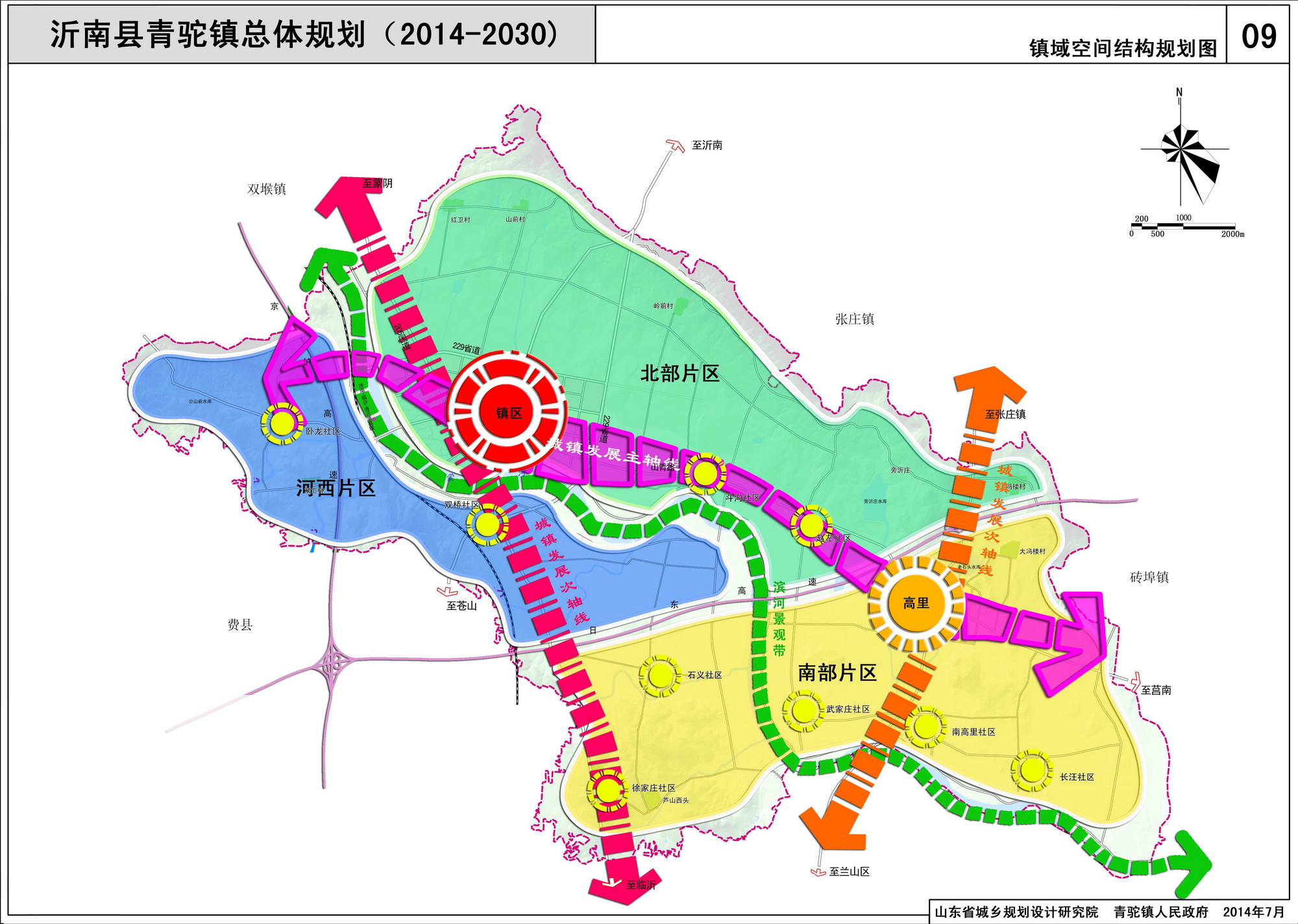 三轴:一是沿山青路形成的东西向的城镇主要发展轴;二是沿205国道的东西向次要发展轴;三是沿高里南北向主路形成的南北向次要发展轴。